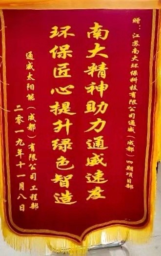 南大精神助力通威速度 環保匠心提升綠色“智”造——南大環保受到通威太陽能(成都)有限公司表彰近日,江蘇南大環保科技有限公司收到通威太陽能(成都)有限公司的錦旗和表彰信,南大環保在年產3.8GW高效晶體硅太陽能電池互聯...